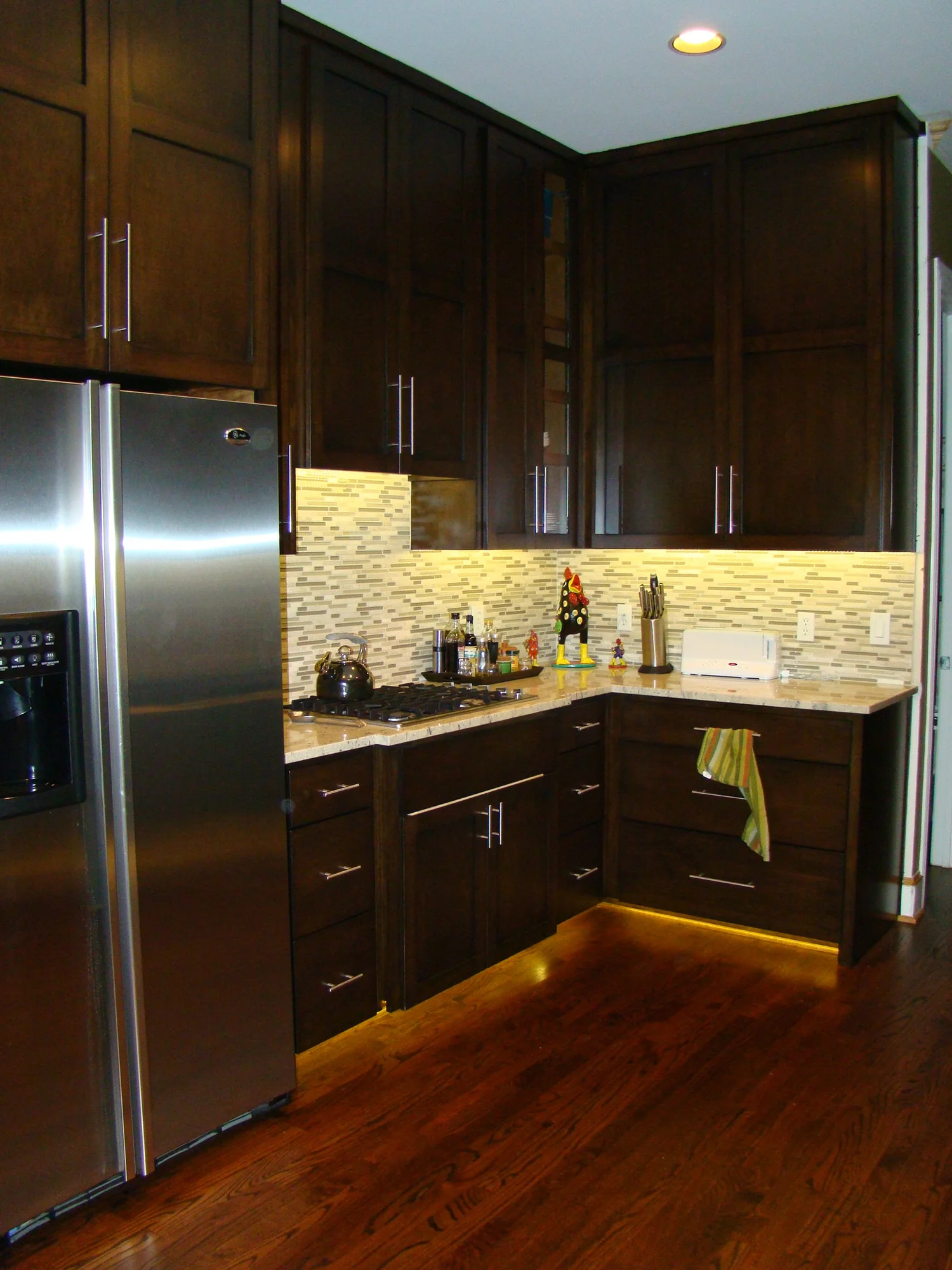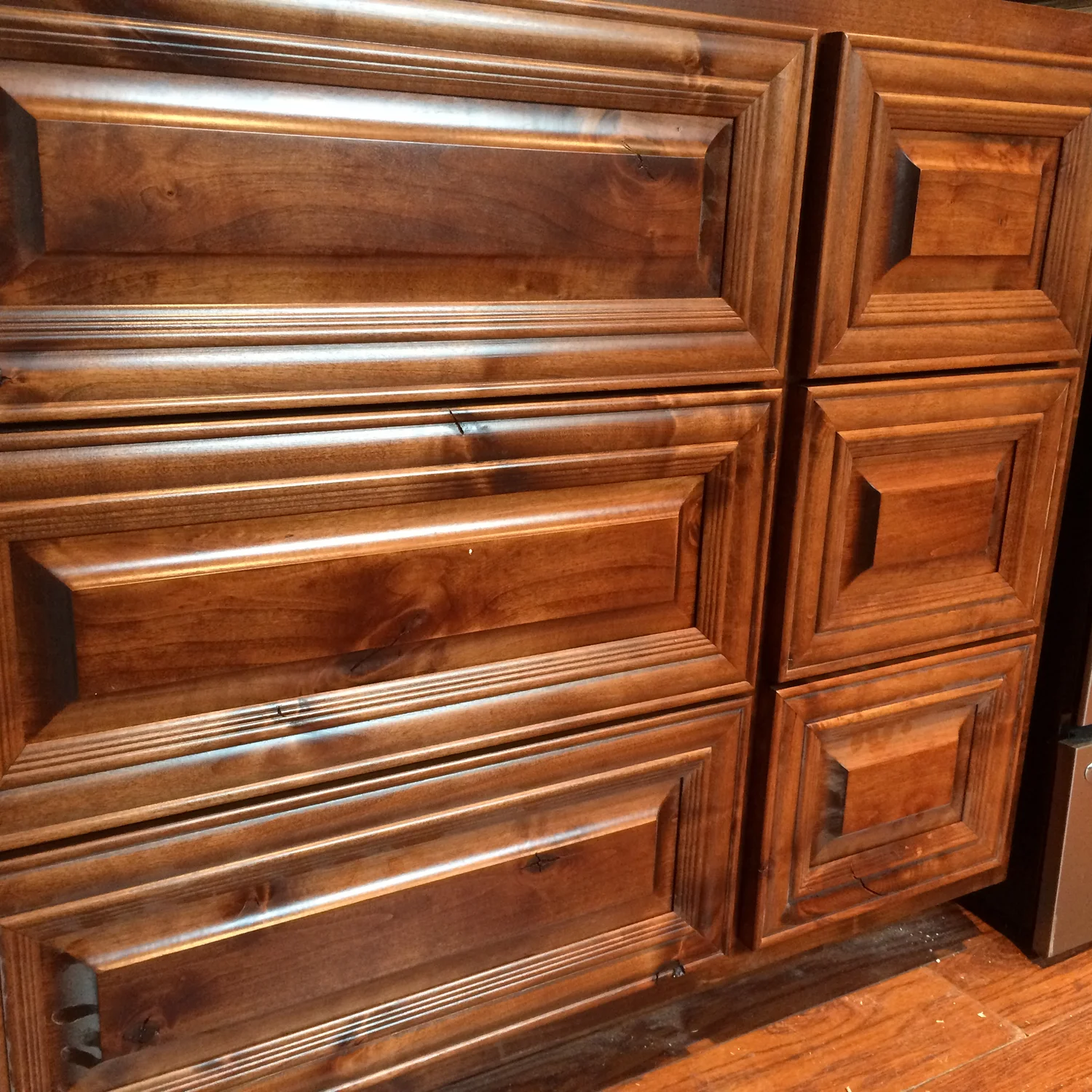 Contemporary stained knotty alder wet bar with wine refrigerator