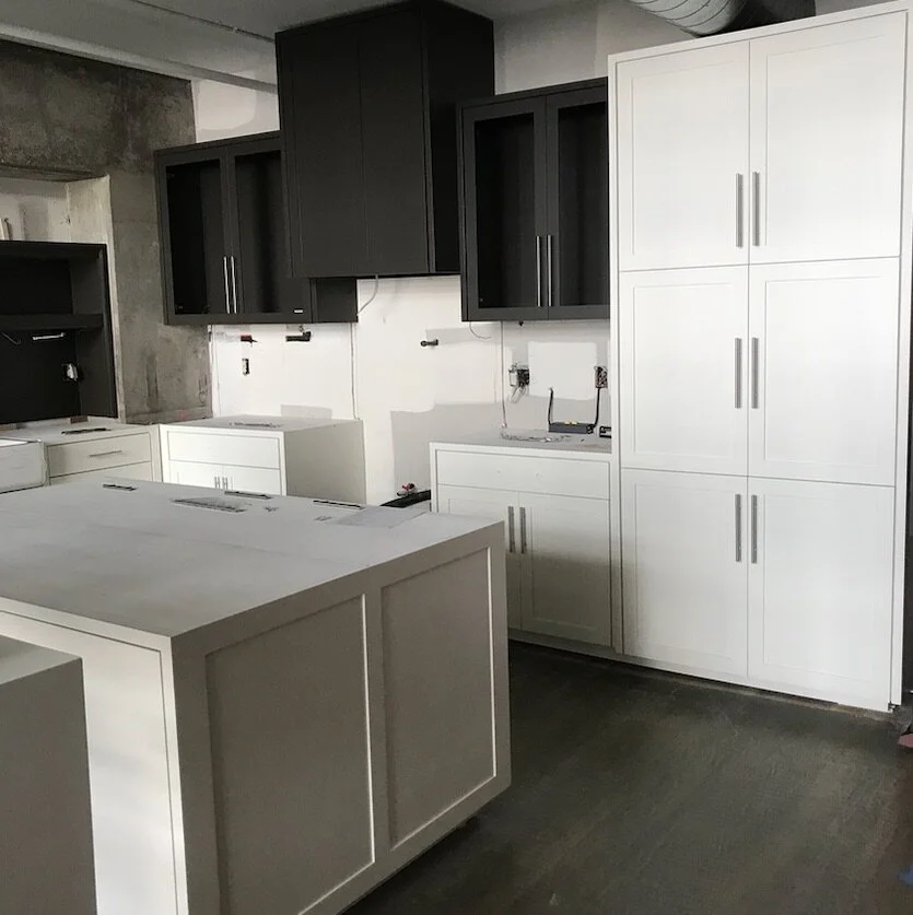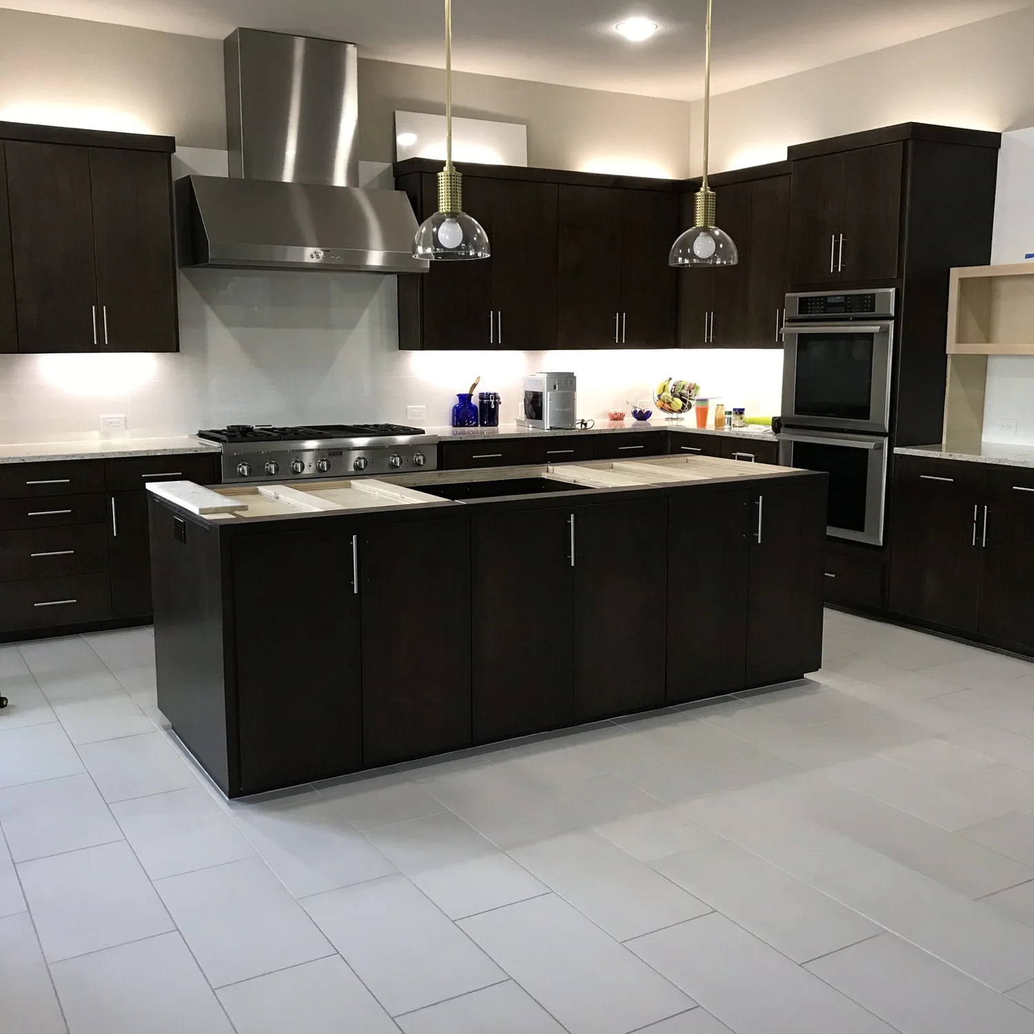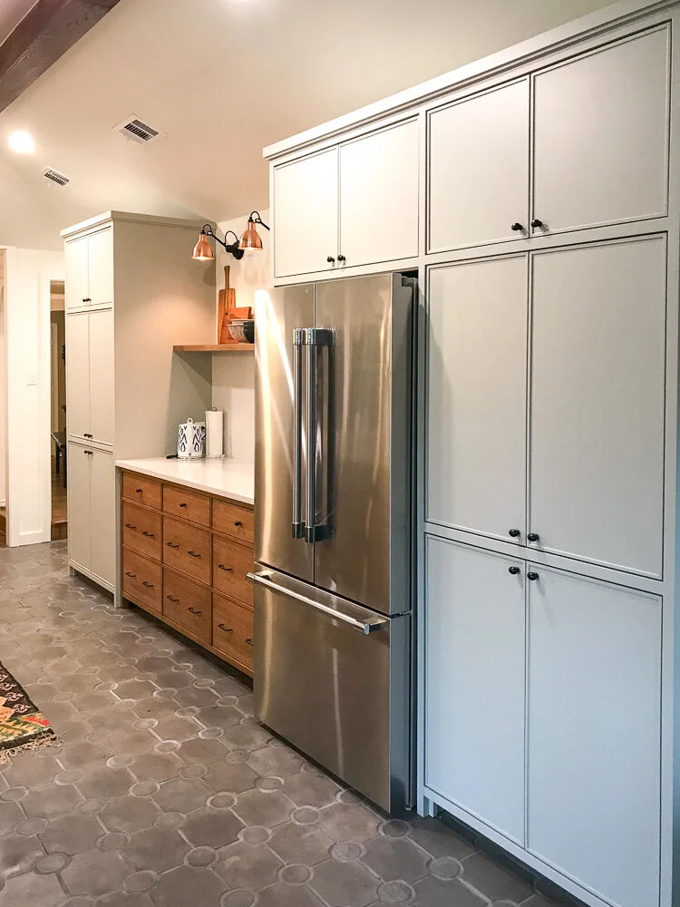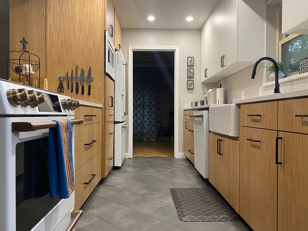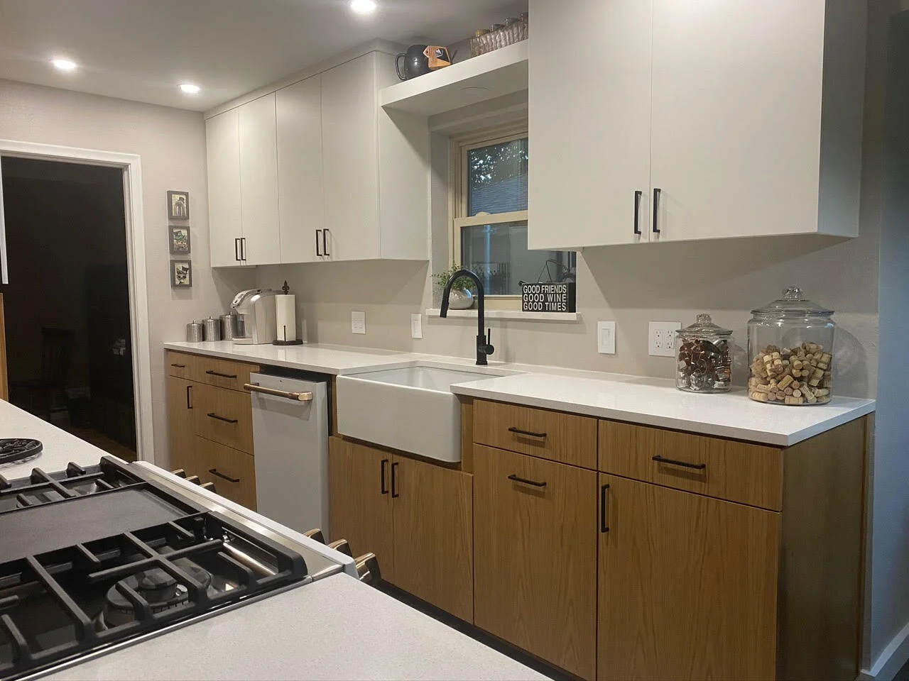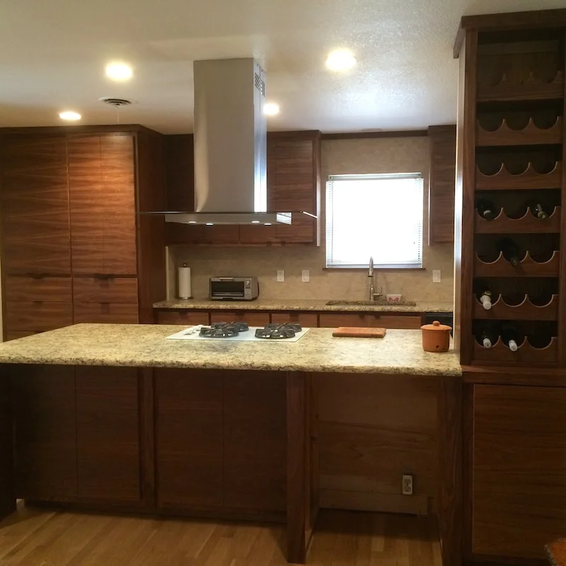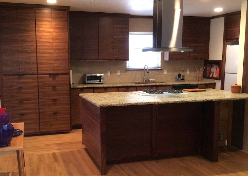 Custom kitchen cabinets, crafted in Dallas, TX.  Lower cabinets are clear coated vertical sequenced matched grain, made from white oak.