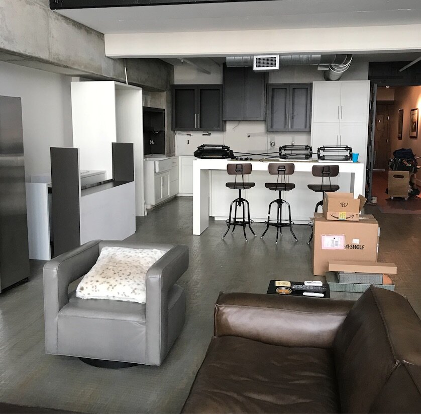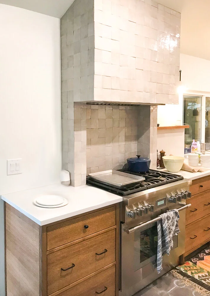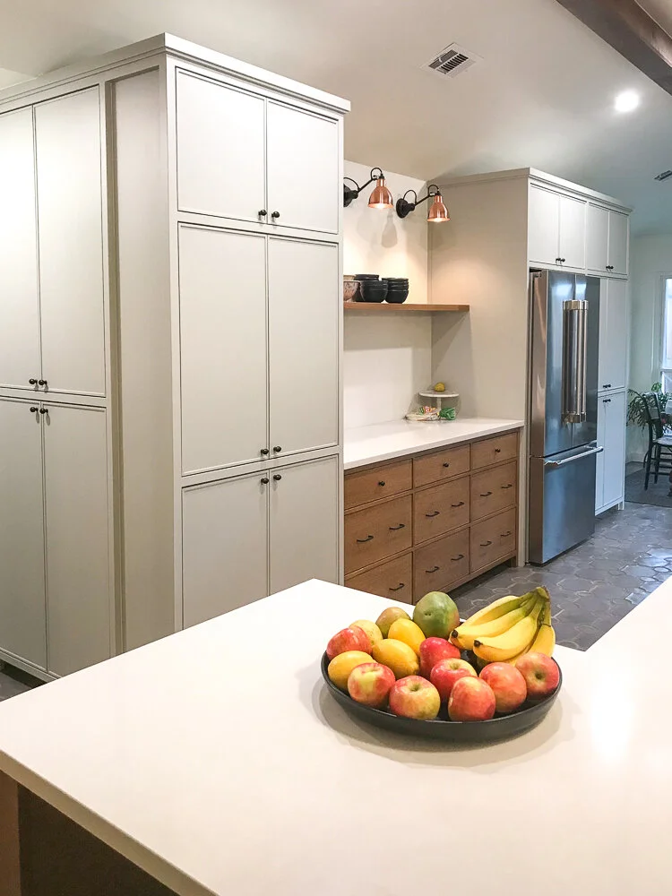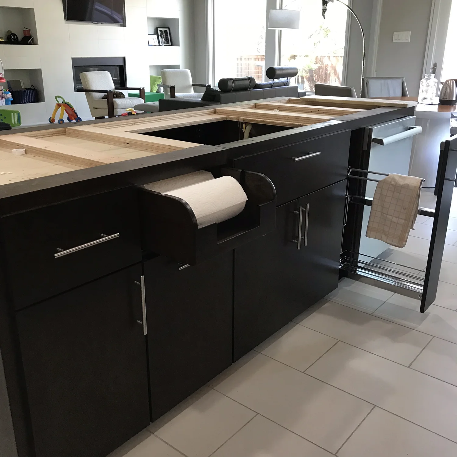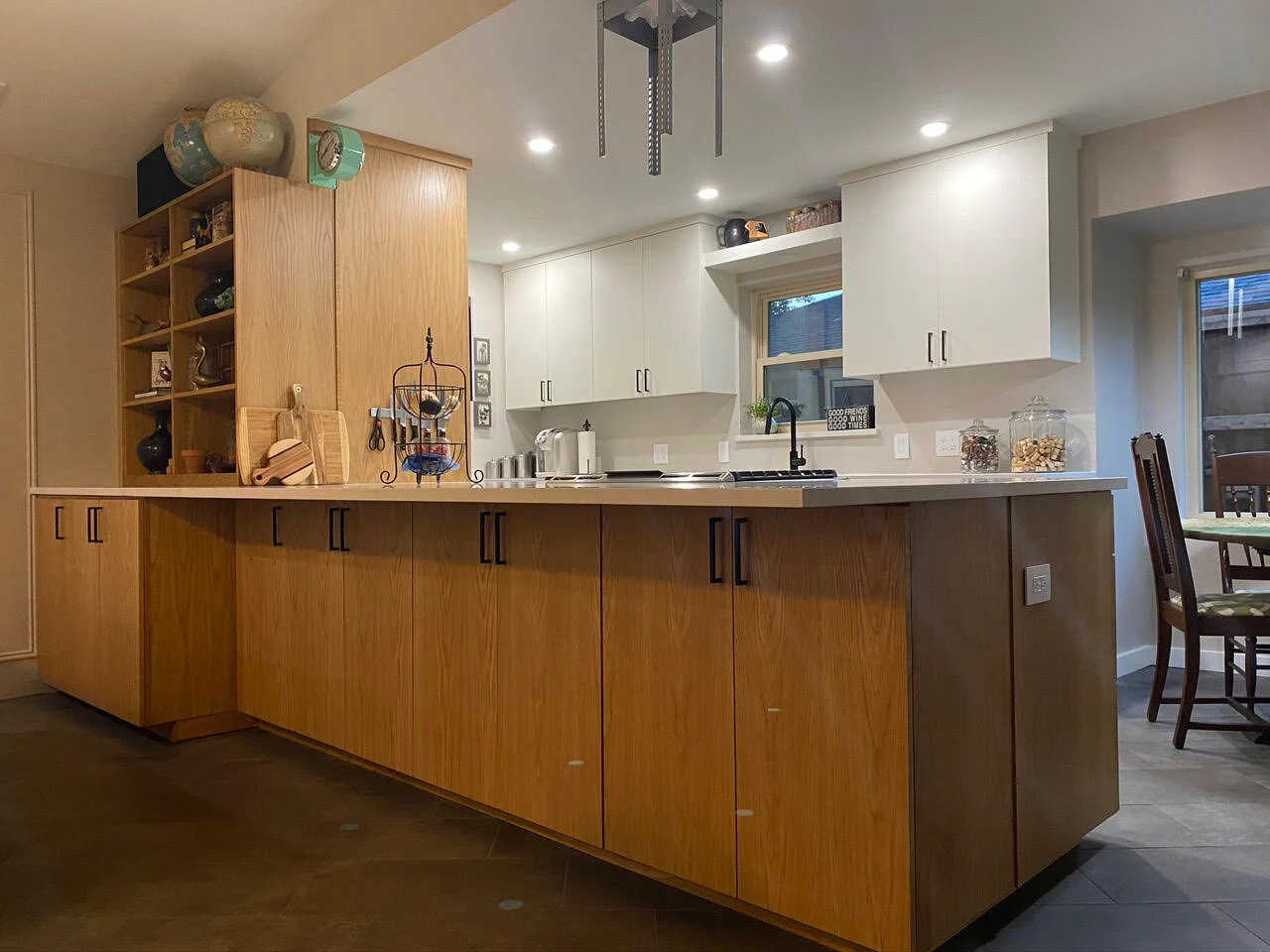 Custom kitchen island with built-in storage and power outlet, made from white oak.